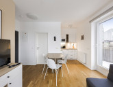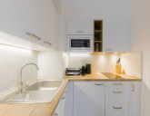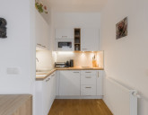 - částečně oddělený kuchyňský kout s jídelní zónou (kuchyň je kompletně vybavena spotřebiči)
