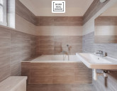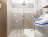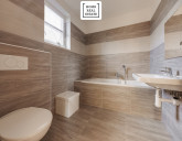 Dům má celkem tři koupelny. Jedna koupelna obsahuje vanu, umyvadlo a WC, druhá koupelna je vybavena sprchovým koutem, umyvadlem a WC, a hostinský WC se sprchovým koutem je umístěn v přízemí. Celkem tedy dům nabízí tři WC, dvě sprchy, jednu vanu a tři umyvadla.