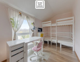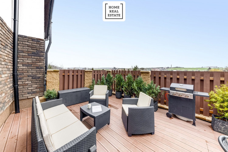 Obývací pokoj s kuchyňským koutem a spižírnou nabízí přímý vstup na terasu se zahrádkou. Master ložnice má vlastní sociální zařízení s WC, sprchovým koutem a umyvadlem. Dům má dále dvě dětské ložnice. Terasa poskytují dostatek soukromí a nádherný výhled na hory Říp a Milešovka.